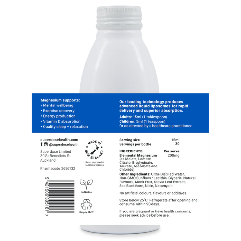 Each 15ml dose contains: Proprietary Mag 7 Blend 200mg magnesium (as malate, lactate, citrate, bisglycinate, taurate, ascorbate and chloride)